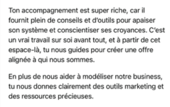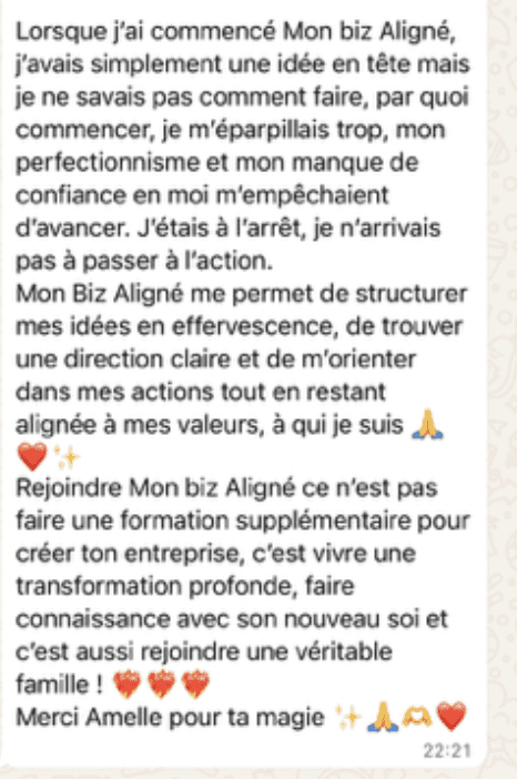« Avec Mon Biz Aligné, j'ai appris à arrêter de me caché derrière de fausses excuses. J'ai commencé à me montrer et poser des vrais tarifs.