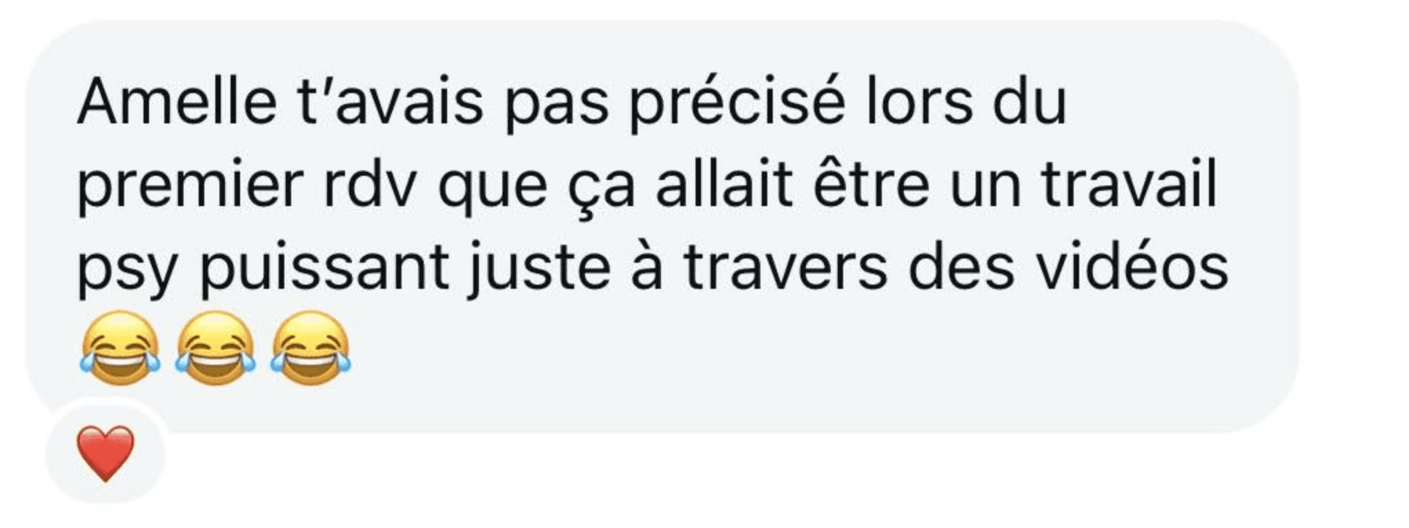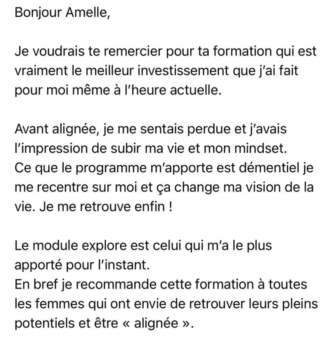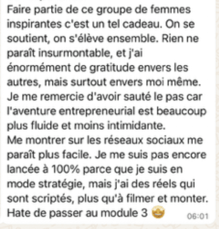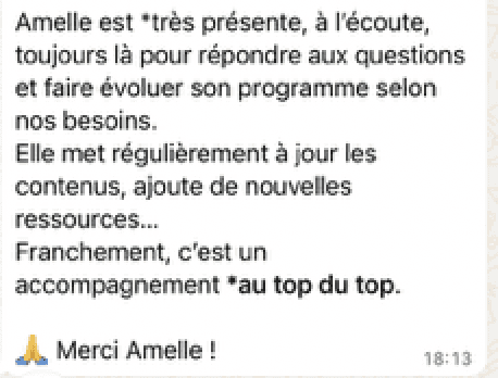 Beaucoup de soutiens entre nous toutes ! Je me retrouvais coincé, et ça m'a rallumé le feu ! Je ne peux que recommander, le programme ressemble à ce que renvoie Amelle. »
